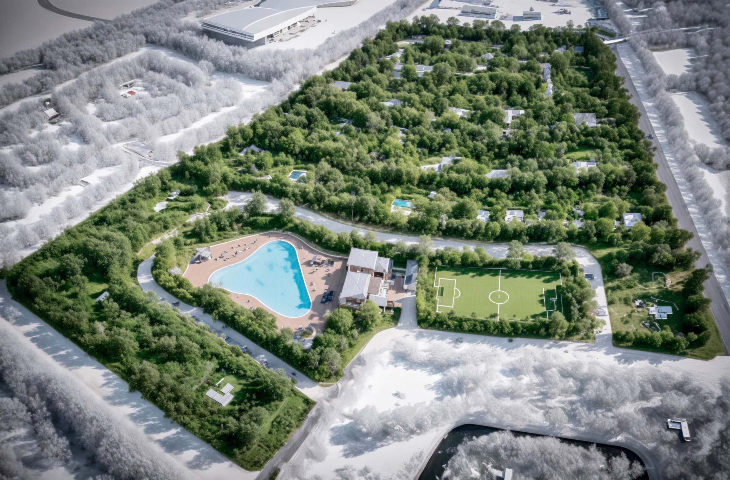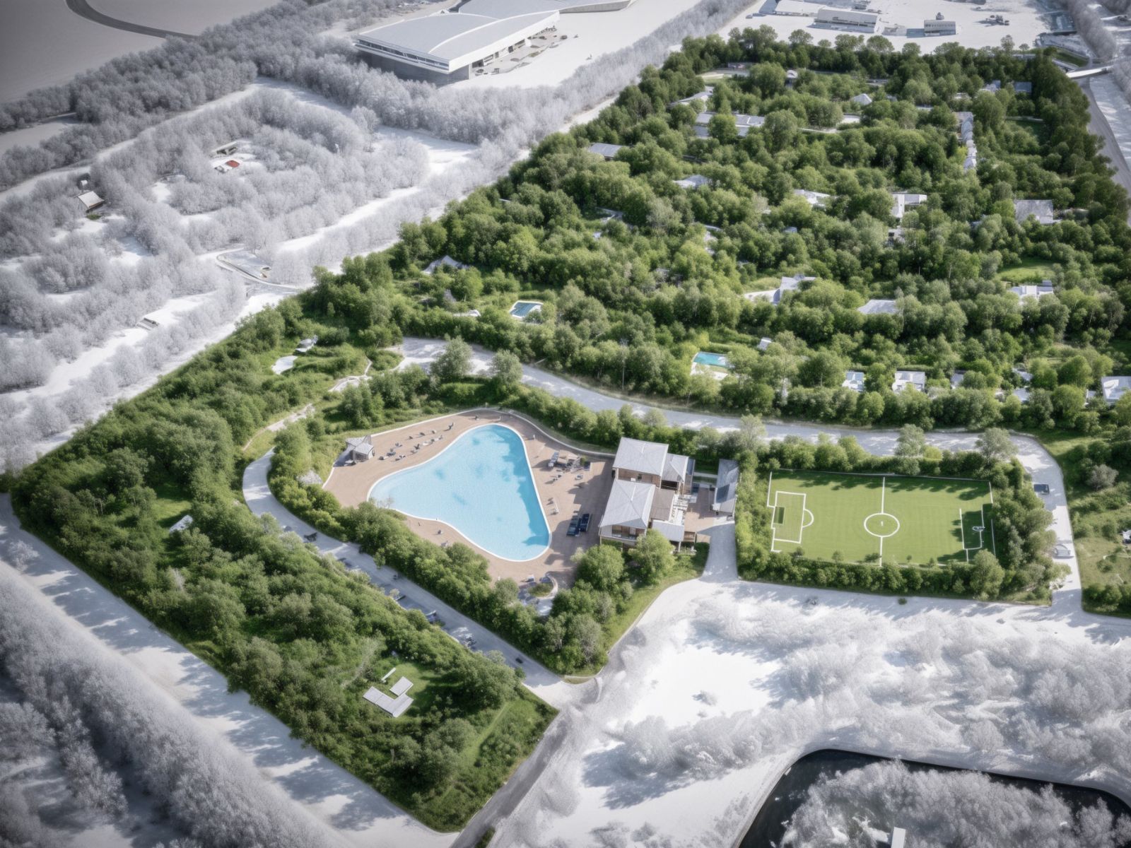 El proyecto incorpora sistemas de captación pluvial, reciclaje de aguas grises, uso de materiales locales y soluciones bioclimáticas que optimizan el confort y reducen el impacto ambiental. El lago central funciona como bioestanque para el manejo del agua y como espacio recreativo.