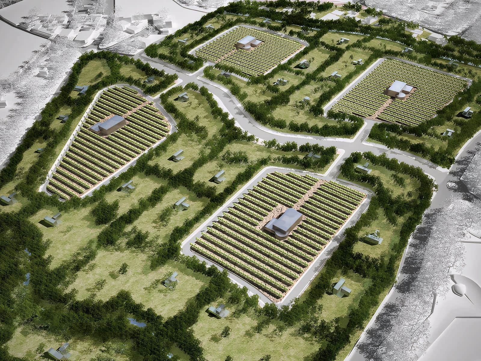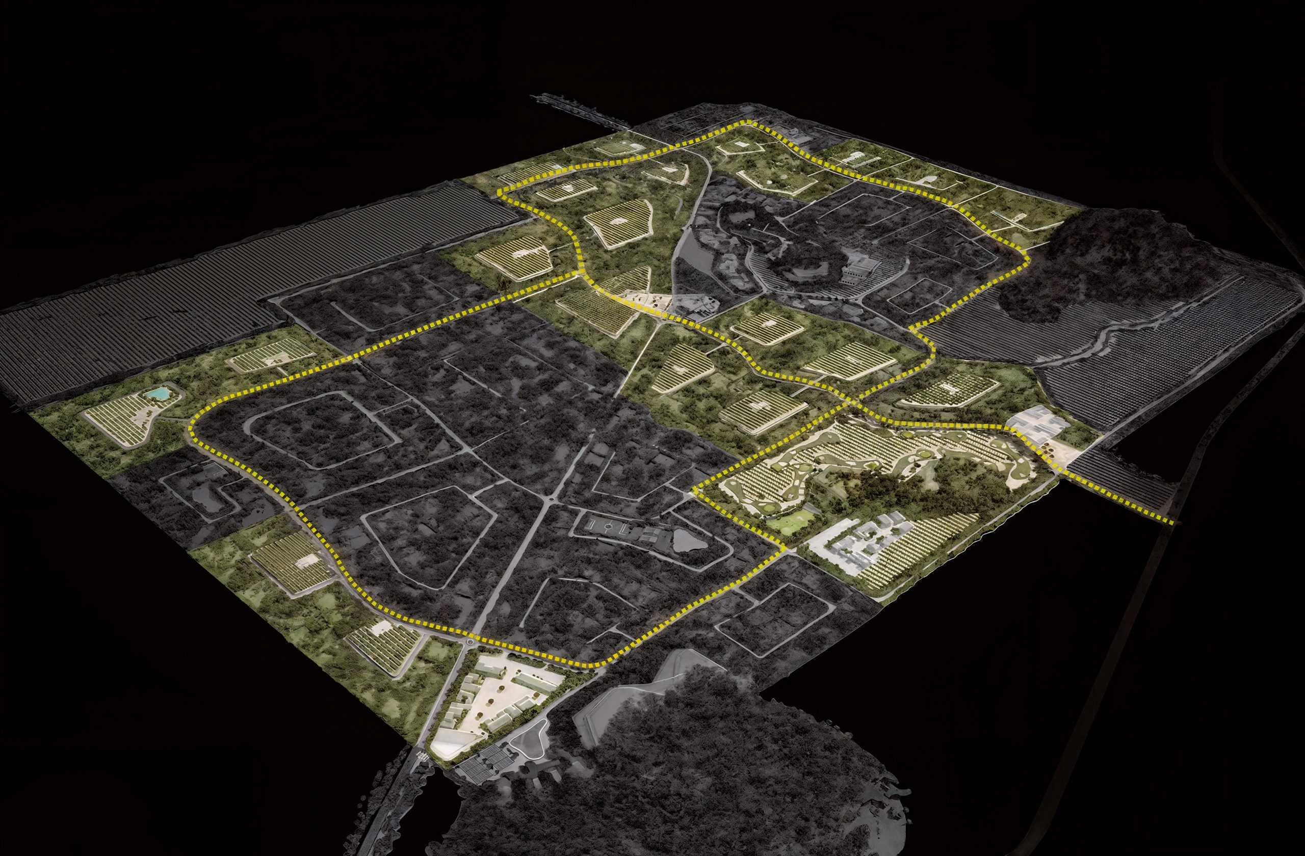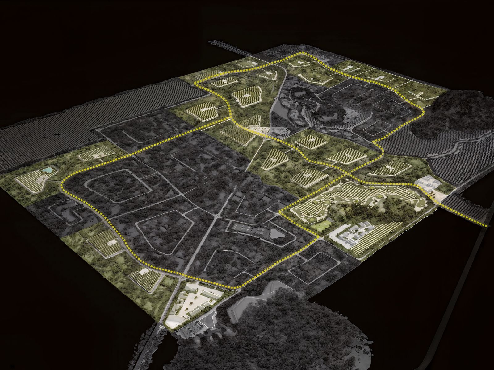 La estructura territorial de Rancho Olivares se apoya en el paisaje productivo como matriz organizativa. Los olivares preexistentes y los viñedos proyectados articulan los diversos usos del suelo a través de una red jerárquica de espacios residenciales, productivos, turísticos y culturales. Esta lectura del paisaje como infraestructura funcional permite una integración armónica entre los componentes urbanos y rurales.